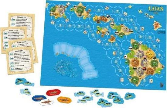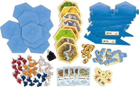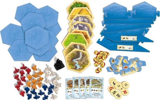| Verpakkingsinhoud | Inhoud:, Basisspel, 19, landtegels, 6, randdelen, 18, getafellenfiches, 4, bouwkostenkaarten, 2, bijzondere, kaarten, 95, grondstoffenkaarten, 25, ontwikkelingskaarten, 96, speelstukken, 1, rover, 2, dobbelstenen, 2, kaartenhouders, 4, doosjes, 1, almanak, De, spelregels, Zeevaarders, 11, landtegels, 19, zeetegels, 6, randdelen, 10, getallenfiches, 10, havenfiches, 57, Catanfiches, 5, wonderkaarten, 60, speelstukken, 1, zeerover, De, spelregels, Scenario's, 1, dubbelzijdig, speelbord, 28, visfiches, 4, vissersboten, 4, vismarktkaarten |
