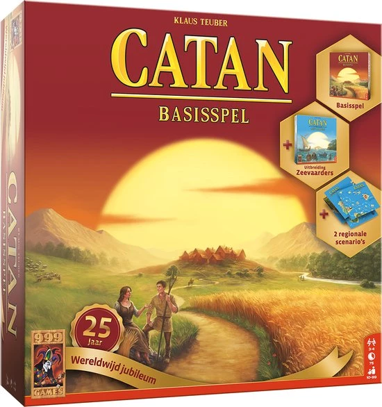 We hebben wat te vieren. Het is 25 jaar geleden dat Catan voor het eerst in de officiële Duitse taal werd uitgegeven. Sinds 1995 heeft dit spel miljoenen spelers wereldwijd vermaakt. In deze speciale jubileumuitgave vind je het basisspel Catan en de eerste grote uitbreiding “De Zeevaarders”. Nooit eerder verschenen deze twee spellen samen in 1 doos. Ook vind je er twee extra regionale scenario’s: Hawaii en Het Iberisch schiereiland. De Zeevaarders 9 nieuwe scenario”s voor Catan voor nog meer variatie. Bouw schepen en ontdek nieuwe eilanden. Hawaii Vestig je op het geliefde vakantie-eiland en leer de bezienswaardigheden kennen. Iberisch Schiereiland Speel Catan op de vlaktes en langs de kust van het Iberisch Schiereiland