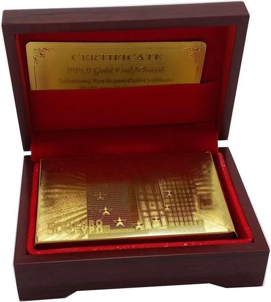 Waarom zou je bij het pokeren nog een zonnebril dragen om je emoties te verbergen? Nu kan je je tegenstanders simpelweg verblinden met dit unieke gouden kaartspel. De kaarten zijn rijkelijk omhuld met een schitterend laagje 24-karaats goud en aan de achterzijde bedrukt met een 500 euro biljet logo. Geleverd in luxe houten opbergbox met echtsheidscertificaat.