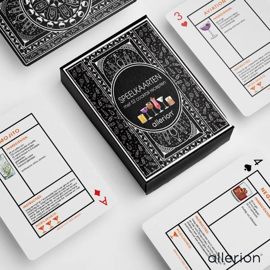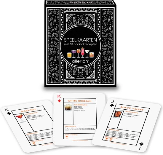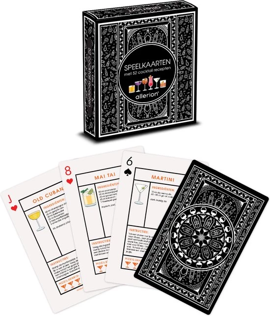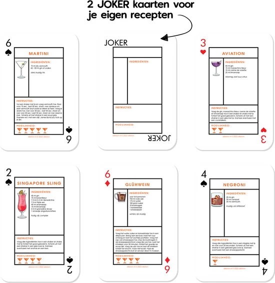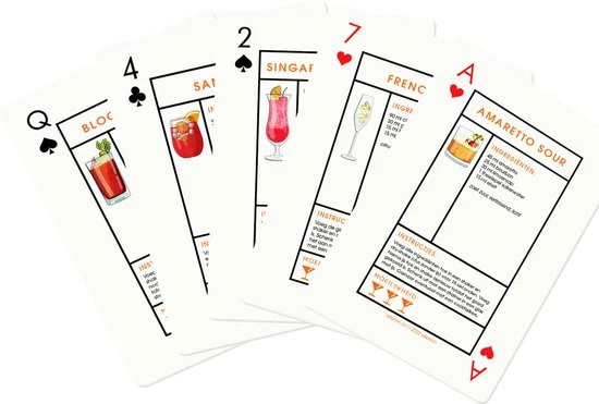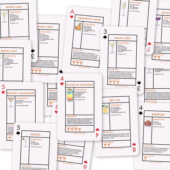 Met maar liefst 54 verschillene cocktails is staat dit kaartspel garant voor heel veel plezier! De speelkaarten zijn volledig custom gedesigned, je zal dus nergens een soortgelijk spel vinden. Inclusief duidelijke ingrediëntenlijst en korte beschrijving hoe de cocktails te maken. En de jokers? Daar kun je jouw eigen favoriete recepten op schrijven. Wat is jouw favoriete cocktail?