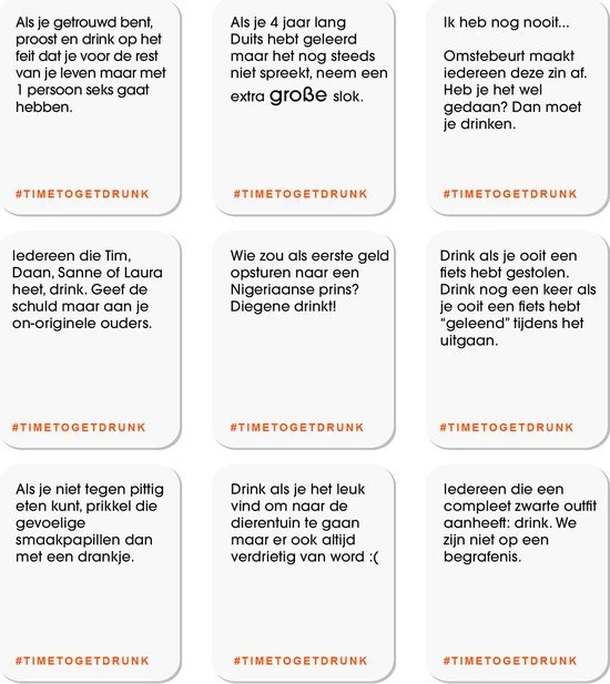 De spelregels zijn super simpel. Schud de 73 kaarten voor gebruik, en pak om de beurt een kaart. Lees deze hardop voor en voer de opdracht uit. Plezier gegarandeerd! Durft jouw team de opdracht niet uit te voeren, of weten jullie het antwoord niet op de vragen? Of ben je later dan het andere team? Dan neem je een slok van je drankje, of moet je zelfs een shotje nemen!