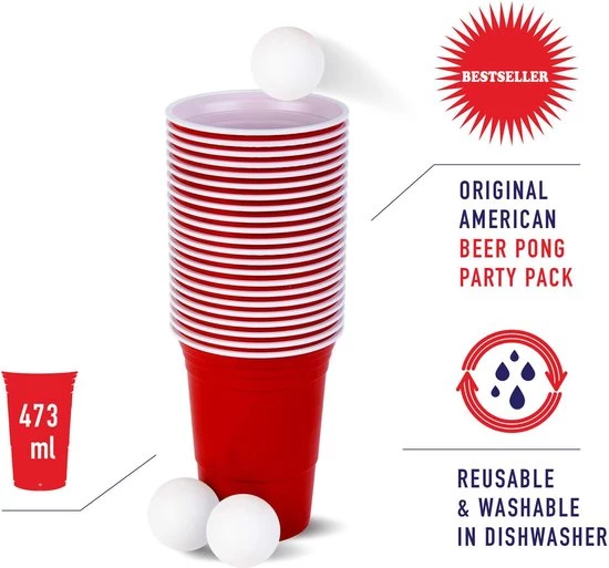 De legendarische Beer Pong Pack. Perfect als cadeau of om mee aan te komen wanneer je onuitgenodigd de housewarming van je buren crasht! Ook ideaal voor het spelen van Flip Cup, Slap Cup & Beer Pong. Inhoud van het pakket: 22 American Red Cups, 3 Beer Pong Balls en d? spelregels van Beer Pong in een mooie verpakking. Ervaar het spel nu zelf!
