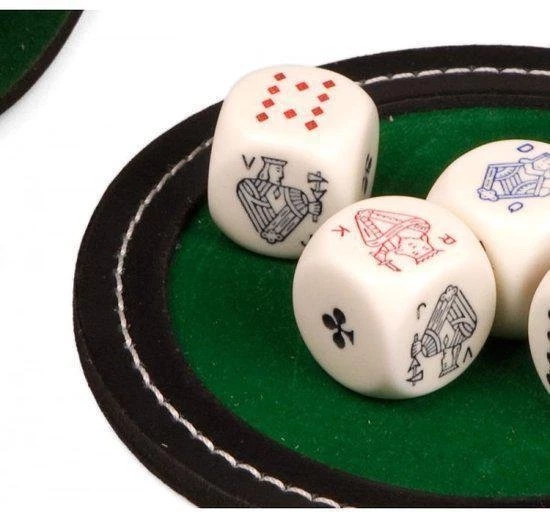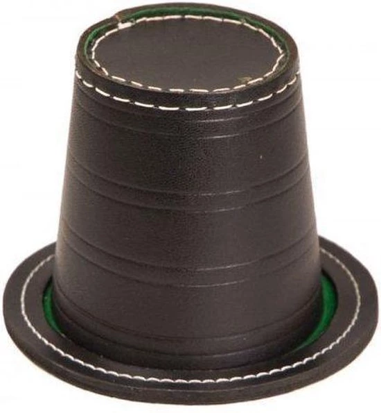 De Poker leugenaar dobbelset bestaande uit een kunstlederen pokerbeker met groen vilt binnenwerk. Inclusief 5 dobbelstenen.