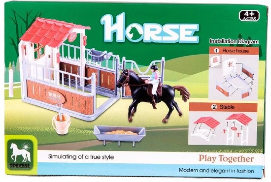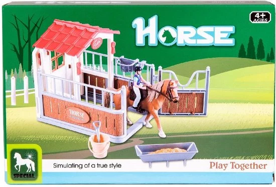 Verzorg jouw paard in deze paardenbox! De paardenbox is voorzien van een dak en heeft een beweegbare staldeur. Met paard, ruiter en accessoires. Geschikt voor kinderen vanaf 3 jaar.