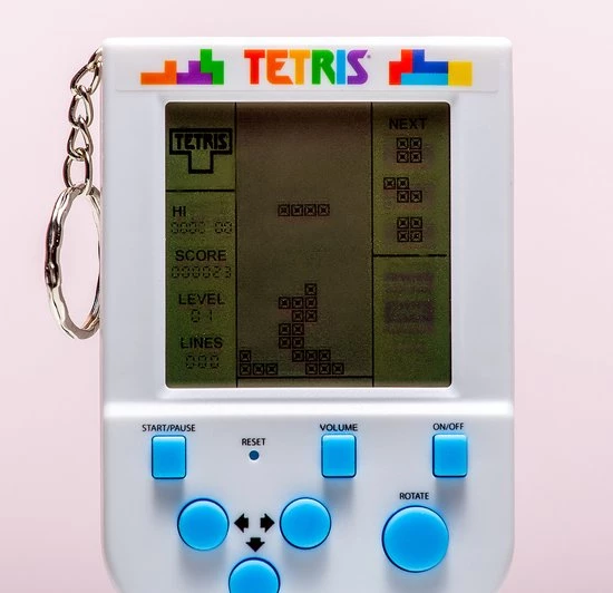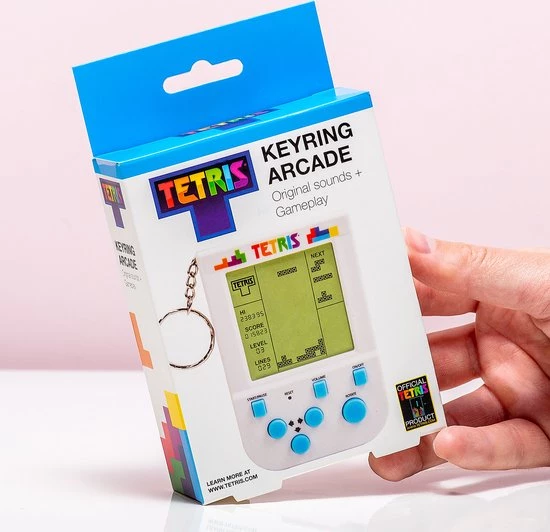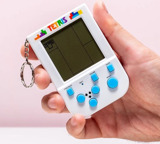 Tetris spelcomputer met sleutelhanger. Sleutelhanger met Tetris game voor aan je sleutelbos. Pocket game in het formaat van een handpalm, met de originele Tetris geluiden en spelregels. Dit spel met LCD scherm zorgt ervoor dat jij je overal kunt vermaken. Met sleutelring om sleutels aan te hangen. Leuk cadeautje voor gamers. Het spel werkt op 2 AAA-batterijen (niet inbegrepen). Afmeting: 9 x 6,5 x 2 centimeter.