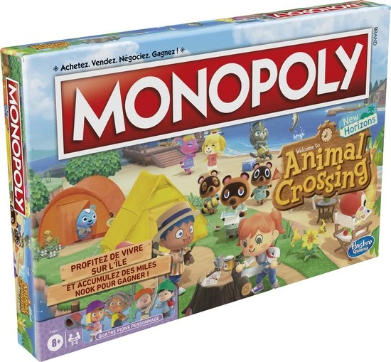 In dit Monopoly-bordspel kunnen spelers genieten van het eilandleven en zich onderdompelen in de kleurrijke en creatieve wereld van Animal Crossing New Horizons. Terwijl de spelers zich over het spelbord verplaatsen met pionnen die ge?nspireerd zijn op de videogame, voltooien ze eilandtaken en ontmoeten ze andere personages. In plaats van eigendommen kopen en huur betalen, verzamelen spelers insecten, vissen, fossielen en fruit. Ze kunnen ook stoppen bij Nooks Hoek voor klingels om decoraties te kopen. Decoraties zijn Nook-miles waard en de speler met de meeste Nook-miles wint het spel. Het Monopoly: Animal Crossing New Horizons-bordspel is voor kinderen vanaf 8 jaar en is een leuke binnenactiviteit voor kinderen. Handelsmerk en copyright 2021 Nintendo. De namen en logo?s van Hasbro, Hasbro Gaming, Parker Brothers en Monopoly, het kenmerkende ontwerp van het spelbord, de vier hoekvakjes, de naam Mr. Monopoly en het figuurtje, evenals elk van de kenmerkende elementen van het bord en de pionnen zijn handelsmerken van Hasbro voor haar beroemde gezelschapsspel en toebehoren.