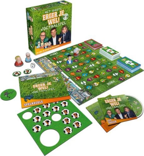 Het Grote ERGER JE WEL Voetbalspel. Identity Games ontwikkelde samen met Voetbal International dit hilarische voetbalspel, waarmee spelers in de huid kruipen van Wilfred, Ren?, Johan of Jan met de mooi uitgevoerde plastic speelstukken.