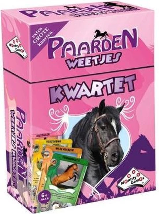 Paarden weetjes kwartet, een oer-Hollands kaartspel waarin steeds 4 kaarten bij elkaar gespaard worden. In dit kwartet vind je allerlei informatie over paarden, afgebeeld op extra grote kaarten. Op deze kaarten staan foto’s en ook nog eens interessante weetjes! Waarom rolt een paard? Wat eet een paard? en nog veel meer!