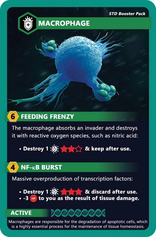 Hou jezelf gezond door zuinig met je HP om te gaan en val aan met infectiekaarten waarbij de hoeveelheid energiepunten (ATP) die je inlegt de ernst van de symptomen bepaalt. Val jij iemand aan die ziek is? Dan kan dit je eigen kop kosten! Er is namelijk een kans dat jij dan ook lijden zal aan de ziekte of het zelfs met de hele tafel deelt!
