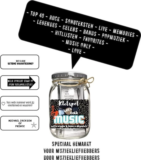 Een Kletspot gevuld met 200 vragen, dillema?s en opdrachten over de wereld van muziek!