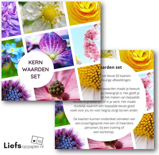 De Kernwaarden set bevat 60 kaarten met waarden en fleurige afbeeldingen. Het bepalen van je (kern)waarden maakt je bewust van datgene wat voor jou belangrijk is. Het geeft je inzicht en een leidraad in het maken van bepaalde