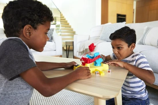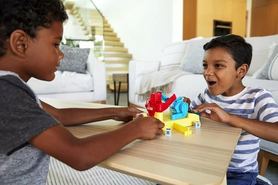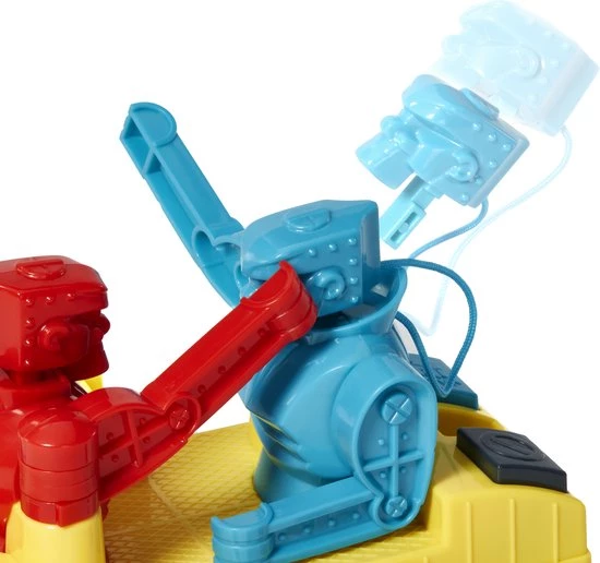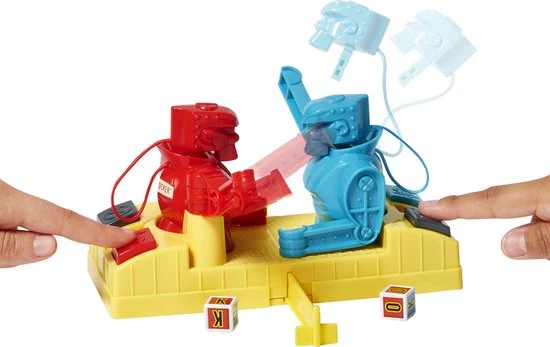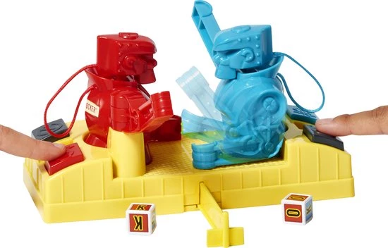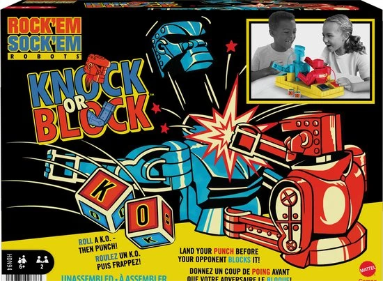 In de Rock ‘Em Sock ‘Em Robots™ game regent het al knock-outs sinds 1964, maar in deze versie gaat het net even anders: een dobbelsteen bepaalt wie er knokt en wie er blokt! Rode Rocker en Blauwe Bom hebben zoals altijd hun vuisten klaar om de blokkering van hun tegenstander te breken. Met de joysticks op de ring kunnen spelers handmatig alle slagen en hoeken regelen. Maar in deze versie bepaalt de dobbelsteen welke robot defensief gaat boksen en op de knop BLOKKEN slaat, terwijl de ander in de aanval gaat en op de knop KNOKKEN slaat! Het doel blijft hetzelfde — breek dwars door zijn blokkade! Een geweldig cadeau voor kinderen vanaf 6 jaar. Kleuren en versieringen kunnen variëren.