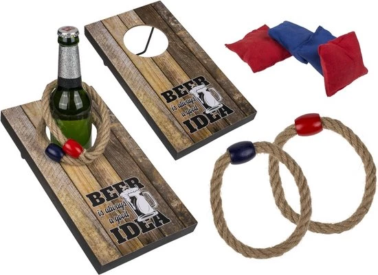 Een drinkspel/drankspel pittenzakken en ringen gooien/werpen, bestaande uit 4 pittenzakken, 2 ringtouwen een bord. Probeer om de beurt de zakjes in het gat op het bord te gooien of zet er een bierflesje in waar u de ringen om moet gooien. Wanneer dit lukt moeten de tegenspelers een drankje nemen! Afmeting bord: ca. 28 x 15 cm. Afmeting zakjes: ca. 4 x 4 cm. Afmeting ringen: ca. D11 cm. Materiaal: hout. Drankspellen/studentenspellen pittenzakken/bean bags gooien en ringwerpen. Let op: dit is geen speelgoed en niet geschikt voor kinderen.