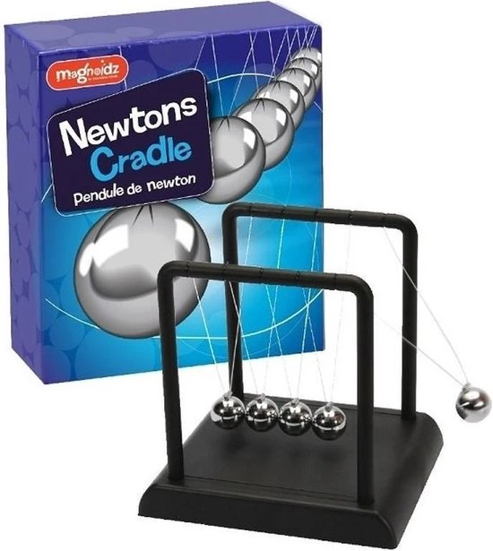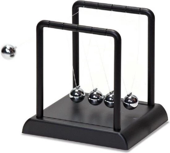 Newton pendel cradle met 5 ballen. Laat een of meerdere balletjes tegen elkaar aan stoten. De beweging van de metalen balletjes is een mooie visualisatie van de wet van Newton van actie en reactie. Materiaal: metaal/nylon. Hoogte: 11 cm. Een mooie kantoor/bureau gadget/eyecatcher.