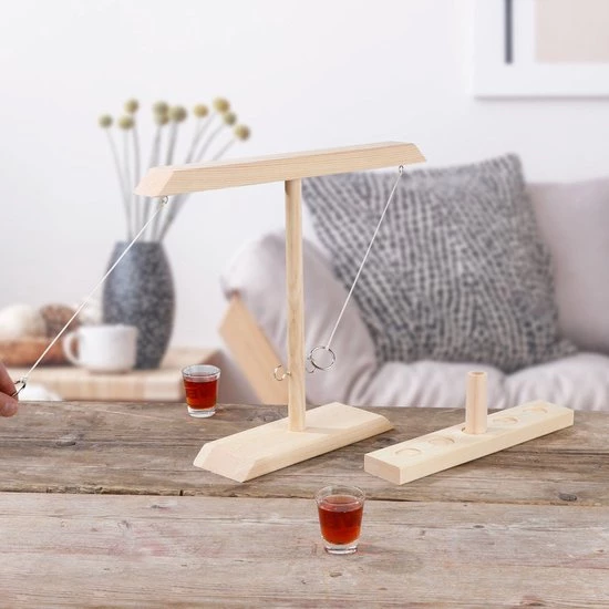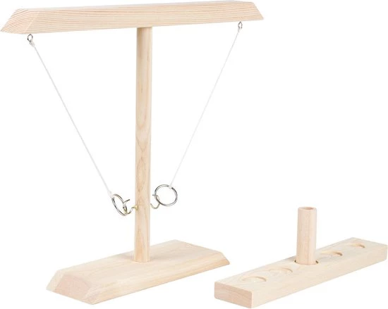 Bij dit klassiek Ring Toss spel proberen spelers een ring te gooien over een haak. Dit lukt natuurlijk niet elke keer waardoor de score heen en weer in het voordeel van een van de twee spelers komt. De ring is aan een touwtje vastgemaakt aan de centrale paal waardoor je de ring niet zomaar verliest. Voor kinderen is dit uitdagend op bijvoorbeeld kinderfeestjes. Maar ook volwassenen gebruiken dit spel voor het bepalen wie een shot moet nemen van hun favoriete drankje.