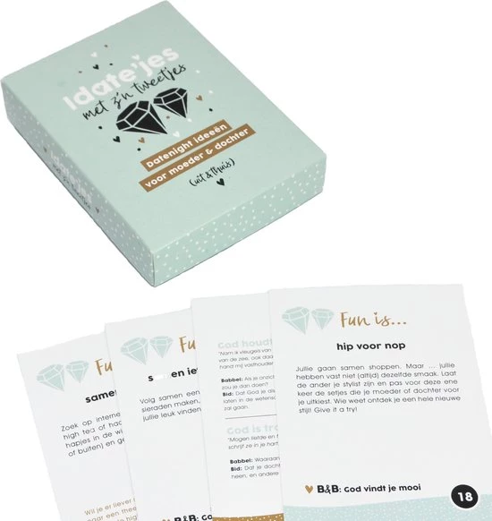 Als extra is er op iedere kaart een verwijzing naar een Babbel & Bid (B&B) thema toegevoegd. De B&B thema?s zijn op aparte kaarten uitgewerkt. Bij elk thema staat een mooie bijbeltekst uit de Psalmen of Spreuken. En luchtige of soms diepere vragen om elkaar te stellen. Weet jij wat de grootste blunder van je moeder is of wat je dochter zou willen doen als ze een dag onzicht- baar was? En wat vind je eigenlijk het mooiste verhaal uit de Bijbel? Je ont- dekt het met idate?jes. Ook staan bij ieder B&B thema gebedsonderwerpen die je als moeder aanmoedigen en helpen om concreet te bidden voor je dochter.