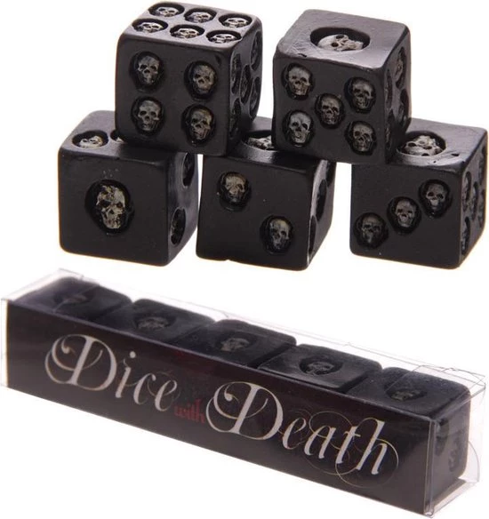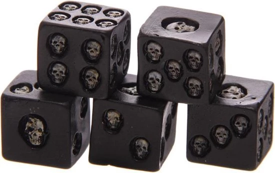 Mooie dobbelstenen met als ogen van de dobbelsteen kleine doodshoofdjes. Hoogte 1.5cm Breedte 1.5cm Diepte 1.5cm