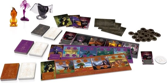 3 plateaux de jeu, 3 pions, 3 sets de cartes M?chant (30 cartes par set), 3 sets de cartes Destin (15 cartes par set), 3 livrets de M?chant, 1 tuile Objectif, 1 jeton Fatalit?, 40 jetons Pouvoir, 3 aides de jeu, 1 r?gle du jeu.