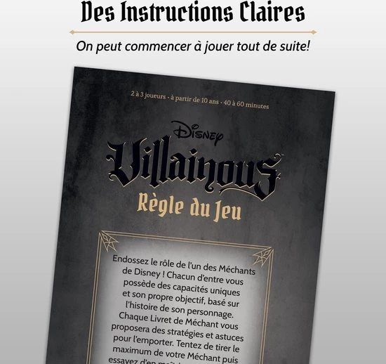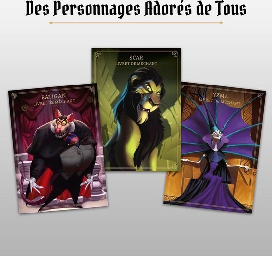 Incarnez un m?chant de Disney et tentez d?atteindre votre propre objectif diabolique avant les autres. D?couvrez 3 nouveaux personnages, soit 3 nouveaux objectifs et 3 nouvelles mani?res de jouer pour devenir le plus grand m?chant Disney : – Scar ?liminera tous ses rivaux du rocher au lion pour devenir le nouveau roi ; – Yzma va tenter de retrouver Kuzco par TOUS les moyens ; – Ratigan utilisera la reine robot pour usurper le tr?ne… ? moins qu’il se voit contraint d’?liminer Basil. Utilisez astucieusement vos capacit?s sp?ciales et tentez de ruiner les plans de vos adversaires. Cette extension de Villainous, le jeu le plus diabolique de l’ann?e, est jouable avec ou sans le jeu de base. R?veillez le Mal qui est en vous et devenez le pire M?chant de tous les temps ! D?s 10 ans.