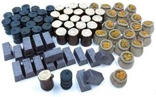 | Verpakkingsinhoud | 20, Grain, sacks, (food)<br, />20, Iron, ingots, (metal)<br, />20, Oil, barrels, (oil)<br, />20, Chopped, Wood, (wood) |