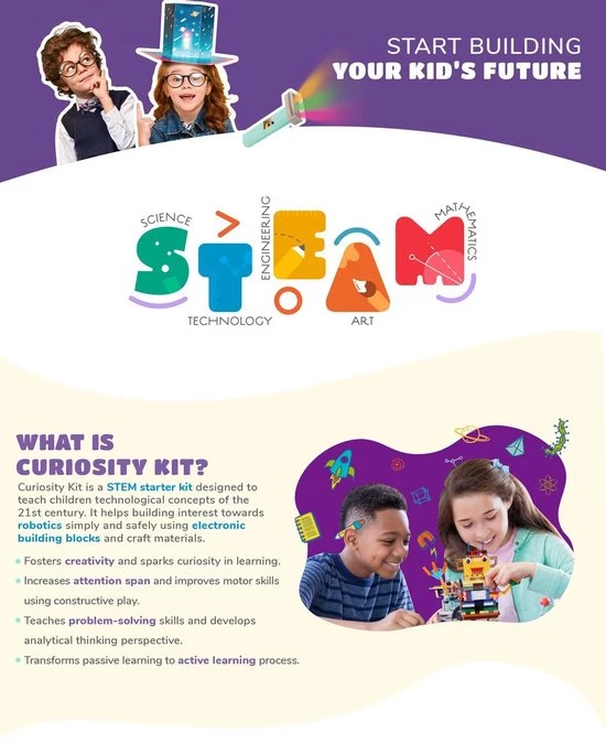 In elk kind schuilt een kleine uitvinder. Laat de verbeelding en creativiteit opbloeien met deze Curiosity Kit. Je zoon of dochter kan hiermee zelf slimme robotica toepassingen maken ? direct klaar om mee te spelen.