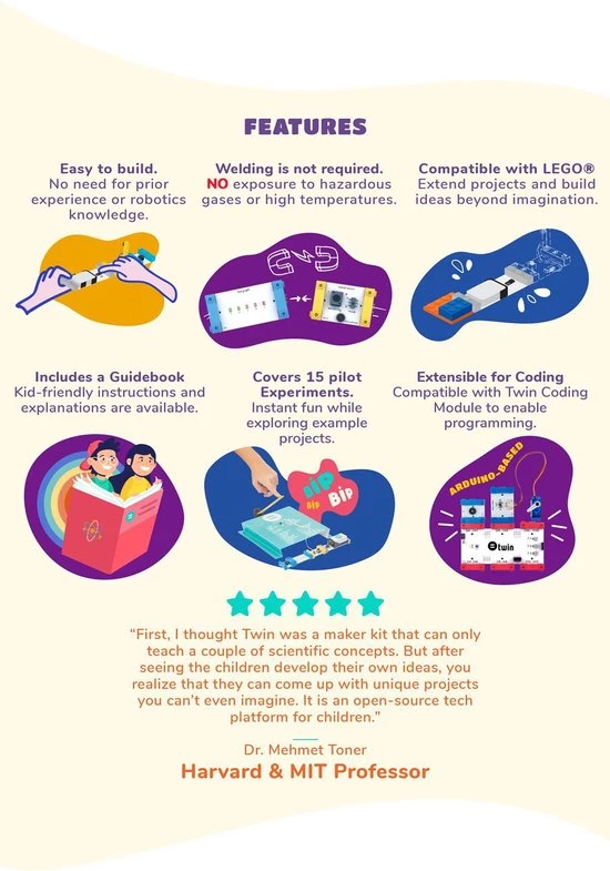 Met het boekje, de Twin Coding app (Experiments) en eigen LEGO kunnen ze tientallen projecten maken!