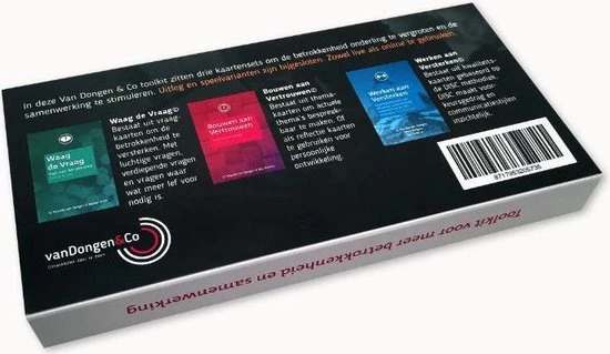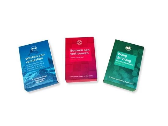 De Van Dongen & Co. toolkit voor meer betrokkenheid en samenwerking – bestaat uit 3 kaartensets voor meer betrokkenheid en effectieve samenwerking. ‘Bouwen aan Vertrouwen©’- themakaarten om dat wat er speelt binnen teams of tussen medewerkers laagdrempelig bespreekbaar te maken. ‘Werken aan Versterken©’- kwaliteitenkaarten om zicht te krijgen op je eigen kwaliteiten en die van collega’s. Gebaseerd op de DISC methodiek. ‘Waag de Vraag©’ – vraagkaarten voor betrokkenheid en samenwerking.